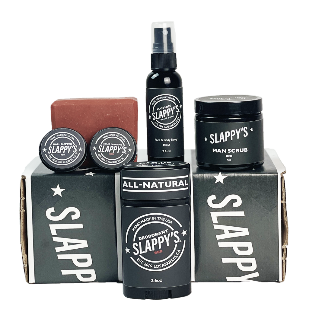 Slappy's team of man types put together just the right amount of manly gear for the essential 60-day survival box in our earthy Red scent. Add this to your 60-day subscription and save big. Includes one man mist, one man scrub, one solid cologne, one ball butter, one full-size Red bar, and one all-natural deodorant.